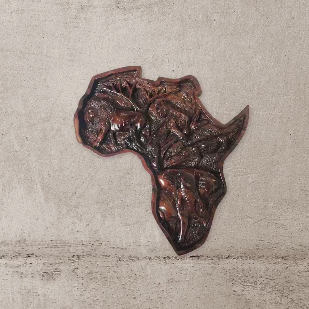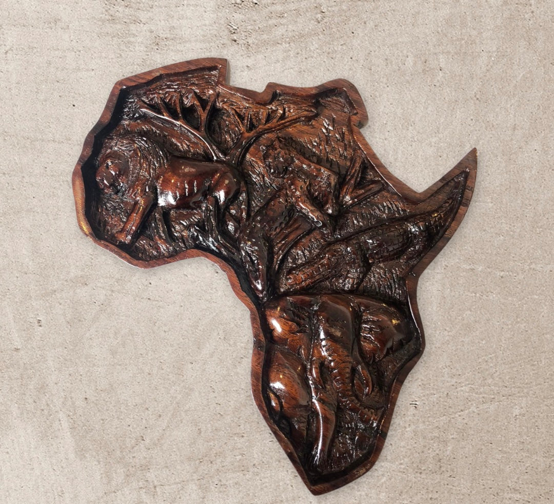 African map wall hangings that are carved out of hard Mugavu wood. The animals carved into the wood comprise an Elephant, Lion, and Leopard.